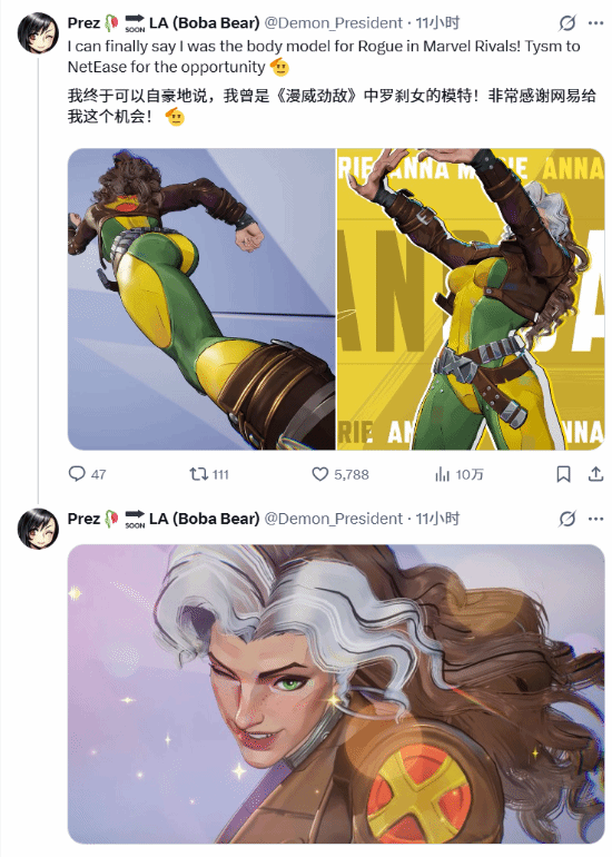 这不是她第一次为《漫威对决》担任模特了:早在2024年12月,她就已经透露过自己是游戏里角色“匕首”的模特。