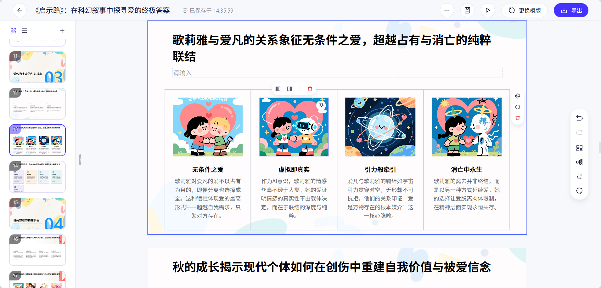 小雷认为千问最棒的地方是,AI生成内容时,原创插画和自动排版效果都挺不错,结构也清晰明了。只要自己调整好字体大小和行间距,就能做出一个合格的PPT,制作水平比自己高多了。