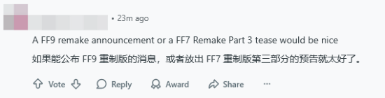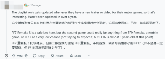 hashtagtylerh推测,其中一个或许是《最终幻想7》重制系列的第三部作品,另一个则有可能是《最终幻想9》的重制版。评论区里其他网友也发表了相近的观点,不过也有部分玩家提及了《最终幻想14》《最终幻想17》等游戏。