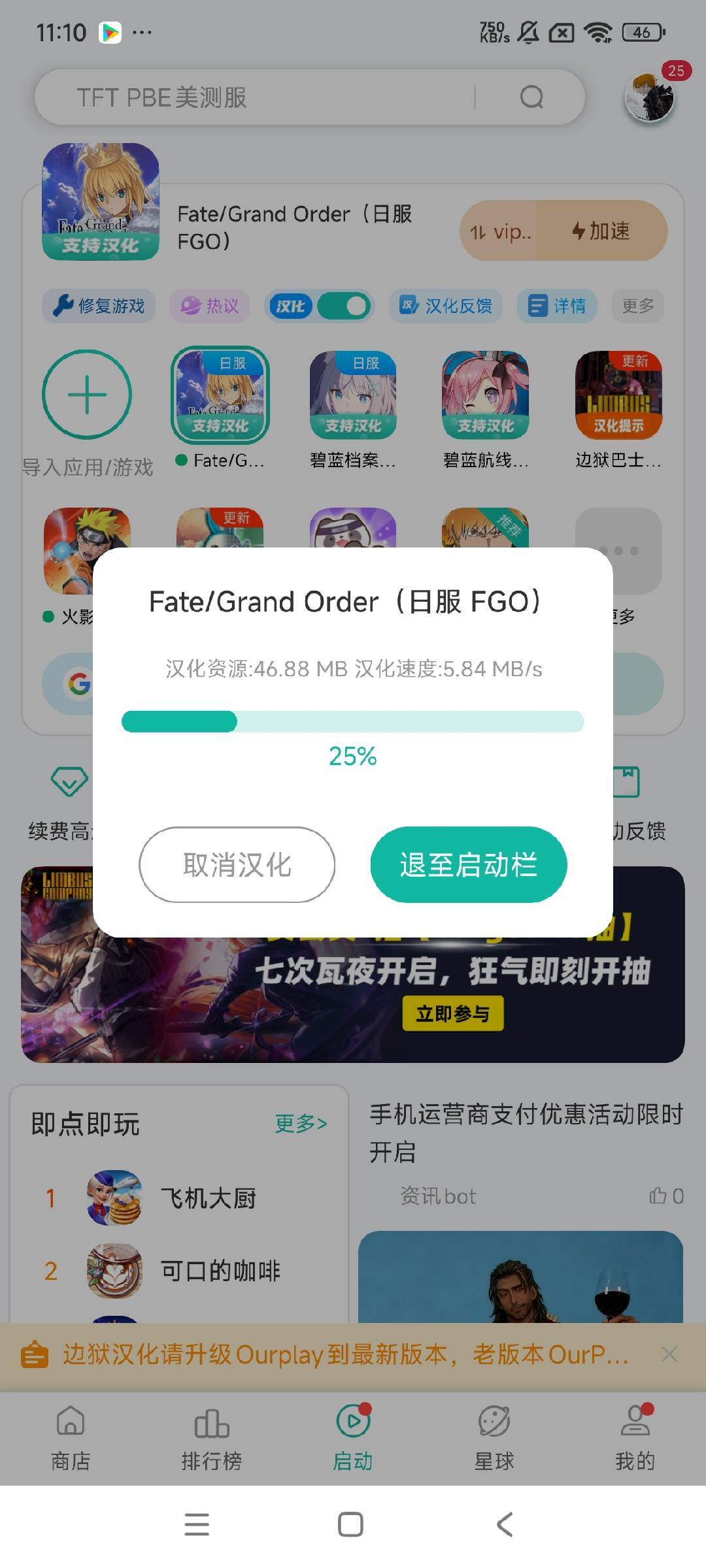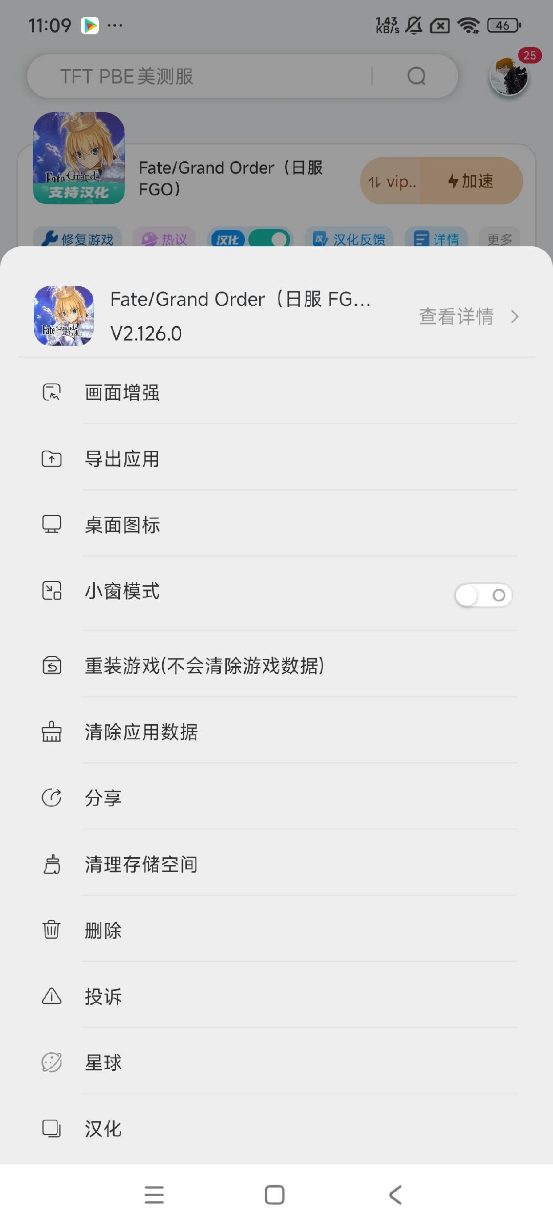 下载完成后,Fate/Grand Order日服 FGO的图标会显示“支持汉化”的标识,此时长按“导入应用”旁的“Fate/Grand Order日服 FGO”小图标按钮,会弹出游戏辅助设置的弹框,在弹框底部找到“汉化”按钮点击即可。