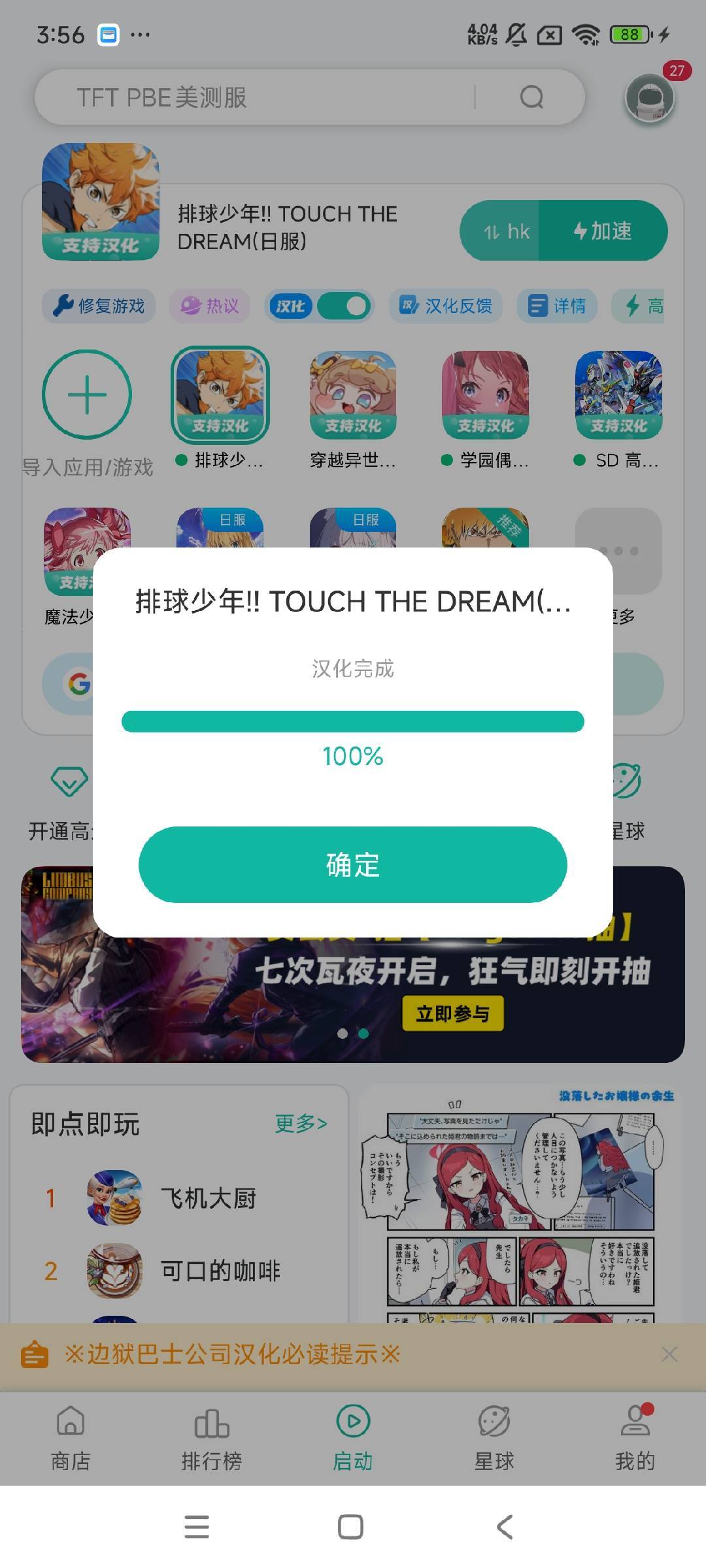 目前《排球少年!! TOUCH THE DREAM》(日服)游戏的汉化工作已全部完成。点击游戏图标后,系统会自动完成加速并启动游戏,您即可体验汉化版的《排球少年!! TOUCH THE DREAM》(日服)。