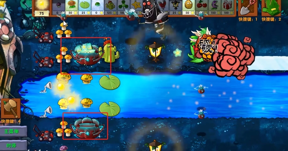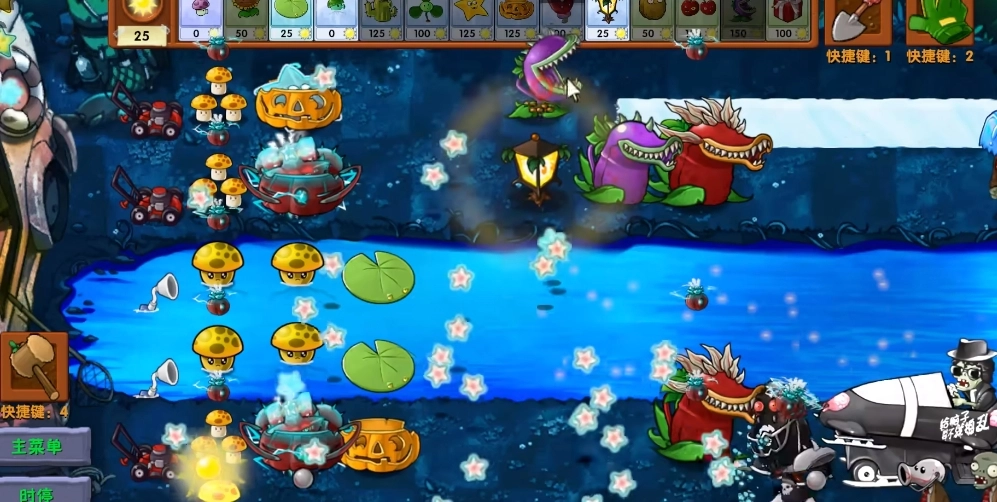 究极激光南瓜的头顶闪烁着微小的闪电,紧接着便开始发射星星来攻击僵尸。