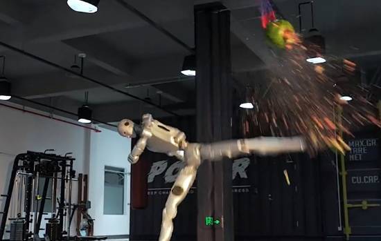紧接着,机器人在空中完成了一个回旋踢的动作,毫不费力地就把悬挂着的西瓜踢得四分五裂。