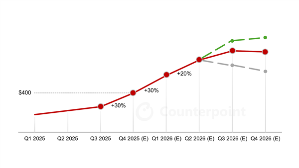 根据Counterpoint的报告,2025年第四季度内存价格预计将上涨30%。在此之前,2025年年初内存价格已经有过50%的涨幅,而到了2026年初,其价格还有可能再上涨20%。