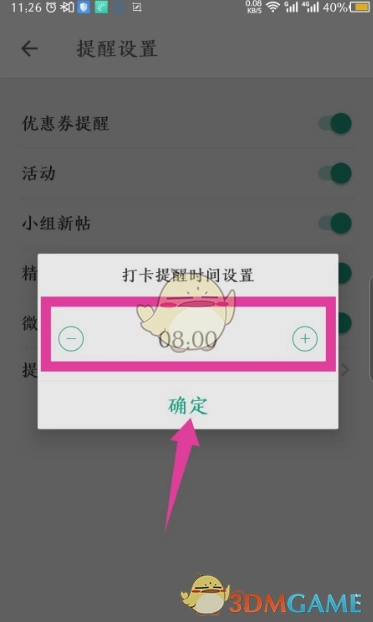 6、在弹出的打卡提醒时间设置窗口内,能够对每天的提醒时间进行设置。