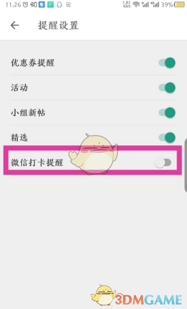 4、接着在已打开的提醒设置中,可看到下方的微信打卡提醒选项,点击其后面的滑块。