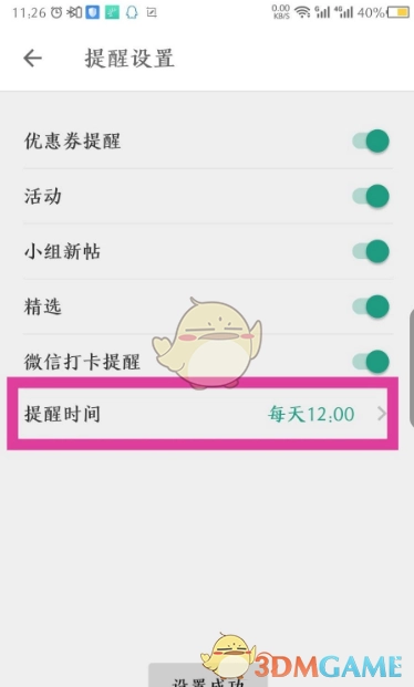 5、点击滑块即可开启,默认提醒时间为每天12点,可点击该时间进行相关操作。