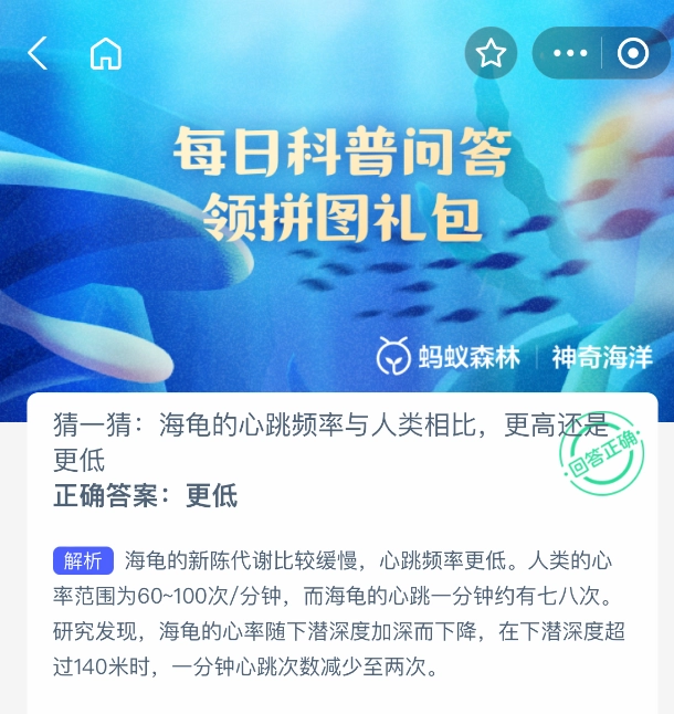 海龟的心跳频率与人类相比,究竟是更高还是更低呢?这里为您分享神奇海洋2025年4月9日的最新答案。若想获取更多相关攻略内容,欢迎点击关注HTML下载站,小编会持续为您更新!