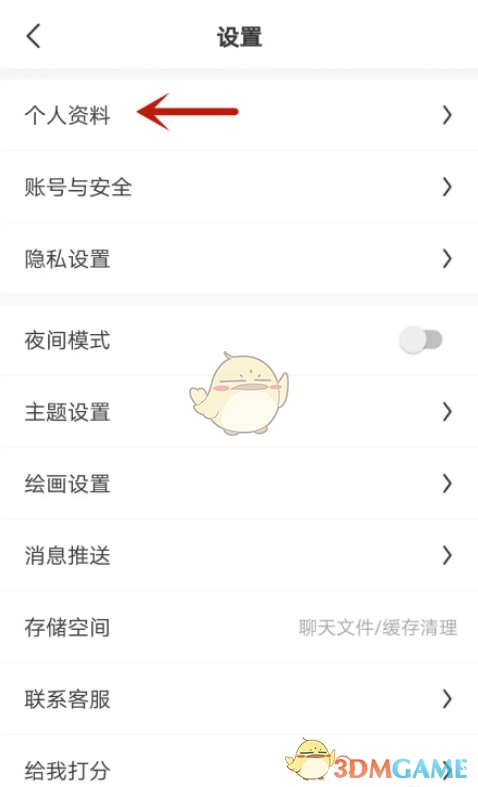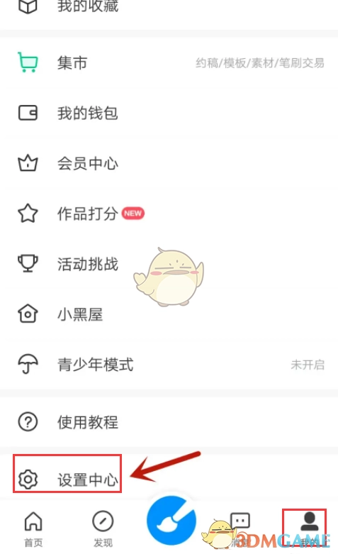 3、进入“我的”界面,点击其中的“设置中心”选项;接着在弹出的“设置”界面里,点击“个人资料”选项。
