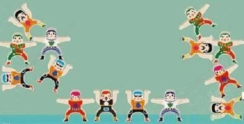 3、第二排:从左到右依次放置,左边放绿衣服小人,中间放2个黄条纹衣服小人,右边放红衣服小人。