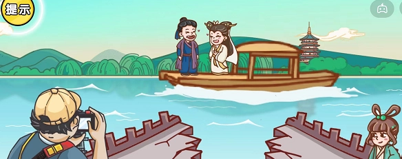 1. 当看到白娘子与许仙面临分离,而远处有一艘船时,若想让这艘船更靠近白娘子和许仙,我们需要点击白娘子的眼睛。