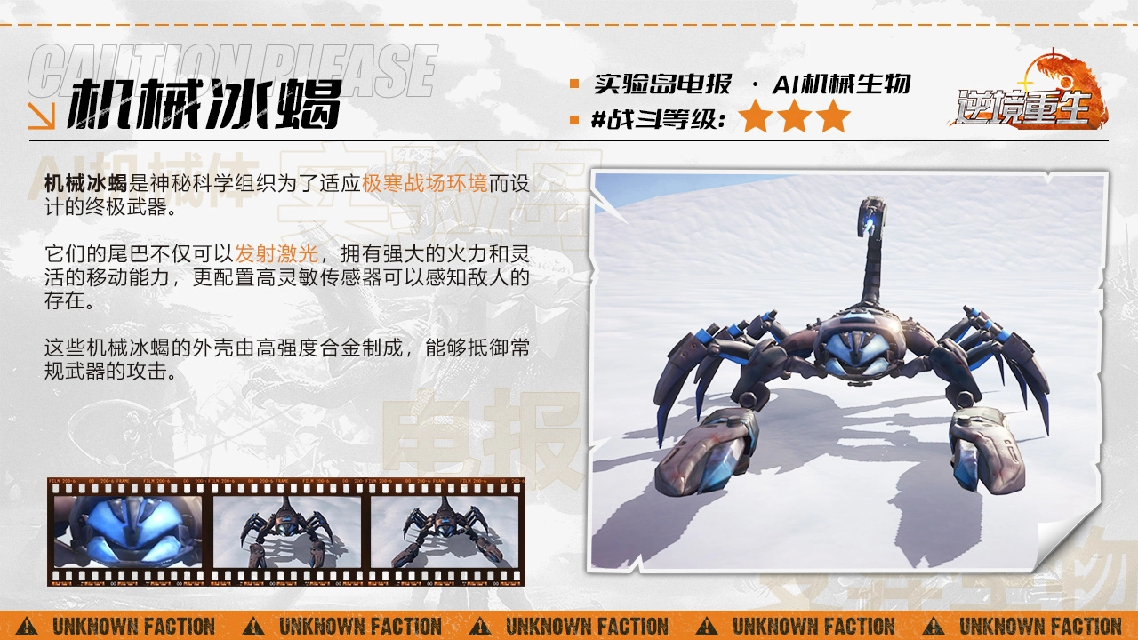 机械冰蝎,乃是神秘科学组织专为适应极寒战场环境所打造的终极武器。其外壳采用高强度合金制造,足以抵挡常规武器的进攻。接下来,为大家呈上小编带来的《逆境重生》AI机械生物之机械冰蝎图鉴,感兴趣的小伙伴们,不妨一同来瞧瞧吧。