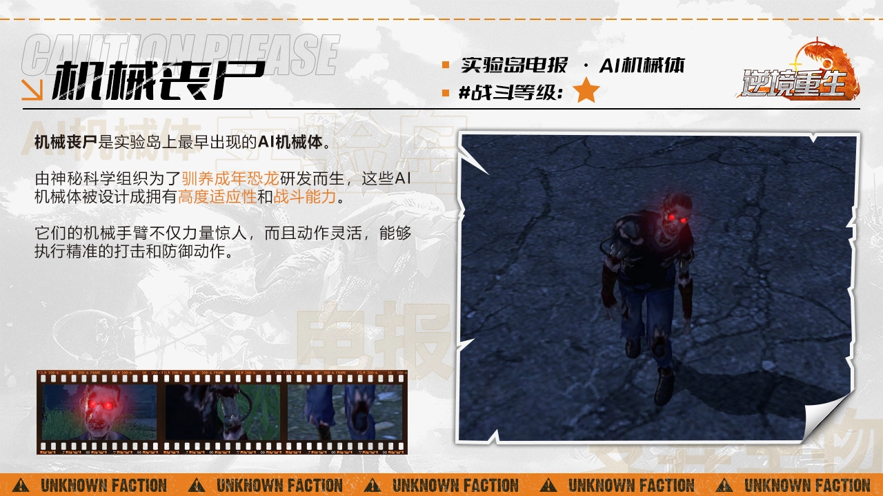 《逆境重生》,这是一款极易上手的末日生存手游。在游戏里的实验岛上,最早现身的AI机械体便是机械丧尸。它们由神秘科学组织研发而出,目的是为了驯养成年恐龙。这些AI机械体被精心设计,具备高度的适应性与战斗能力。接下来,是小编为大家带来的《逆境重生》AI机械体之机械丧尸图鉴,感兴趣的小伙伴们,不妨一同来瞧瞧吧。