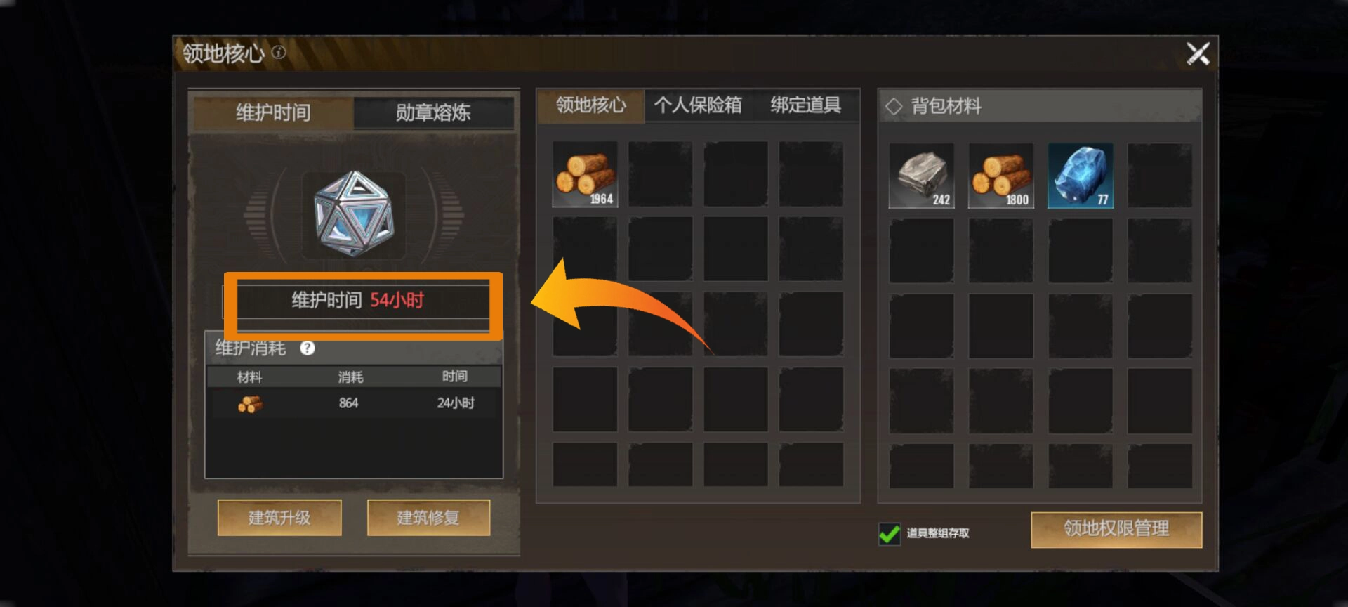 务必在领地柜中放置足够数量的木头,领地柜右侧会提示腐蚀时间。一旦建筑遭到腐蚀就会消失,需要重新建造。所以要定期查看建筑状态,并及时补充物资。