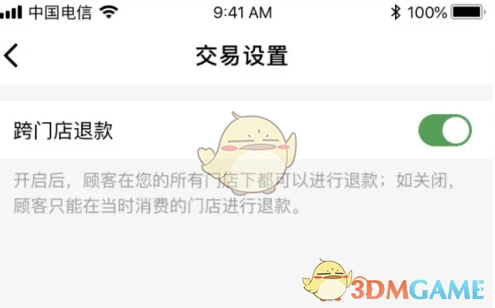 3、此外,多门店的商户默认允许跨门店退款。若多门店老板想要设置不允许跨门店退款,可在APP的设置 - 交易设置中关闭开关(该功能仅多门店老板可见)。