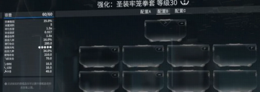 牢笼套备受欢迎,关键在于它在格斗武器里基础伤害值最高,触发概率也高达34%,为所有格斗武器之最。此外,它还自带槽位。玩家一旦拥有牢笼套并合理安装,战甲的移动速度就会提升5% 。
