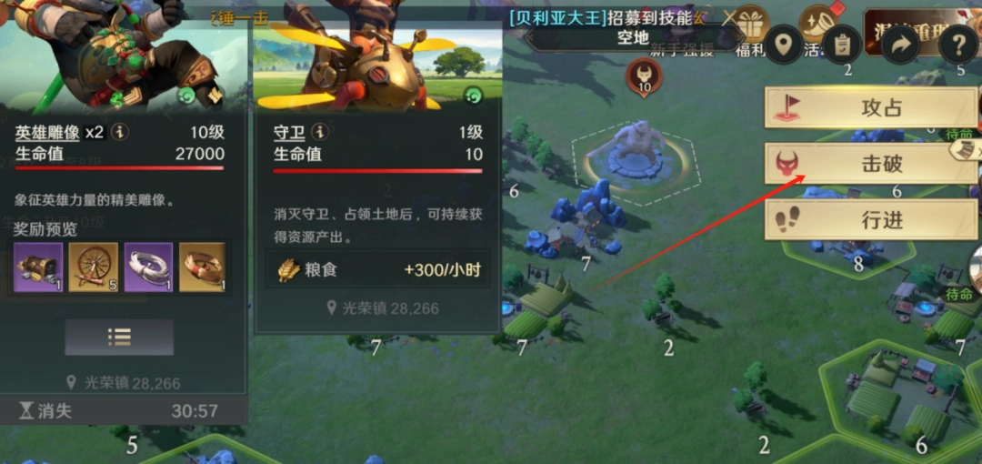 通过消耗战略卷轴攻打英雄雕像,是获取装备锻造材料的常见途径之一。英雄雕像的守军战力相较于同等级土地略高,若攻打失败,不会得到奖励,且战略卷轴仍会消耗。所以,城主们应依据自身实际状况,挑选合适等级的英雄雕像发起攻打。