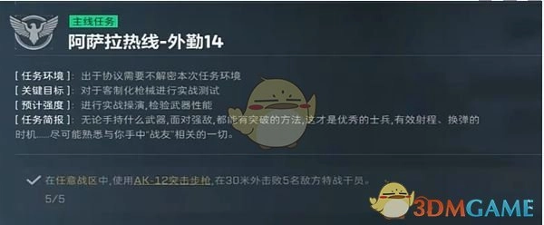 在任意战区中,使用 AK-12 突击步枪在 30 米外击败5名敌方特战干员。