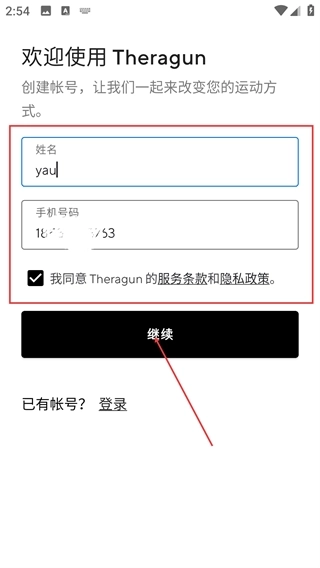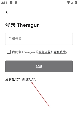 2、在登录页面,输入手机号码并勾选“Theragun的服务条款和隐私政策”,如果没有账号,就点击“创建帐号”进入注册流程。