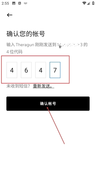 4、进入账号确认页面后,输入Theragun发送的4位验证码,点击【确认帐号】按钮完成验证,之后就能进入应用使用相关健康功能了。