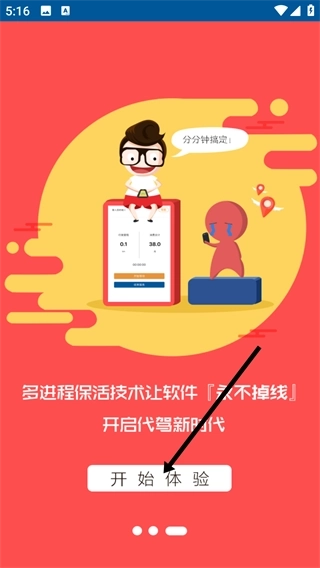 1、在展示页看到【多进程保活技术】能实现软件【永不掉线】后,点击页面下方的【开始体验】按钮,即可进入代驾相关功能界面。