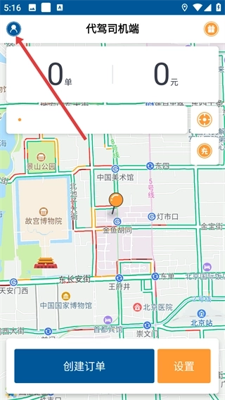 2、打开【代驾司机端】的地图页面,能看到自己当前所在的位置,页面底部设有【创建订单】按钮,点击该按钮即可启动代驾订单的发起流程。