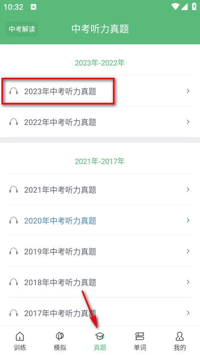 4、最重要的功能来了:历届中考听力真题,此功能包含前几年所有的中考听力,并且不断更新,含金量十足的真题,可以提前练起来。