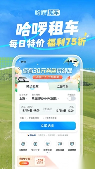 哈啰出行顺风车推出了多种租车服务供用户前往目的地,是一款出门在外时十分实用的新型约车出行软件。用户选定地点后,只需选择合适的车辆服务,稍作等待便会有司机前来接送。此外,还可以选择单车租赁,通过自由骑行来体验别样的旅游出行方式。