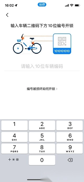 输入车辆二维码下方的10位编号即可开锁成功。