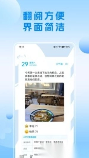 这款软件的用途十分广泛,它能生动地留存每日的生活印记,还能精准捕捉那些细微的情绪波动。当你在一段时间后回顾这些记录时,便能清晰地梳理出情绪的整体脉络,从而更有效地进行自我调节,避免被负面情绪主导日常状态。