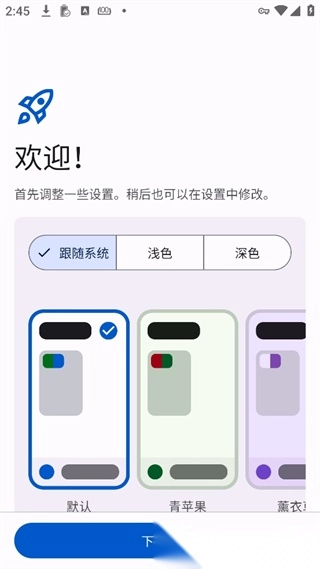 软件安装完毕首次启动时,需完成几项基础配置:先挑选一个合心意的主题样式,再点击界面上的“下一步”按钮继续流程。