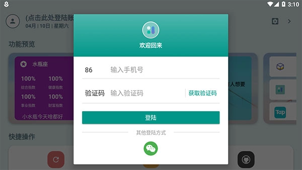在首页能看到各类功能模块,点击首页左上方的头像图标,输入手机号与验证码,或者点击微信就能一键登录。