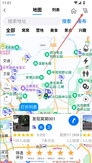 先点击列表底部的“窝窝”选项,接着找到页面右上角的筛选按钮,通过它来设定距离区间、风格偏好以及排序规则,从而筛选出符合需求的窝窝位置。