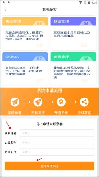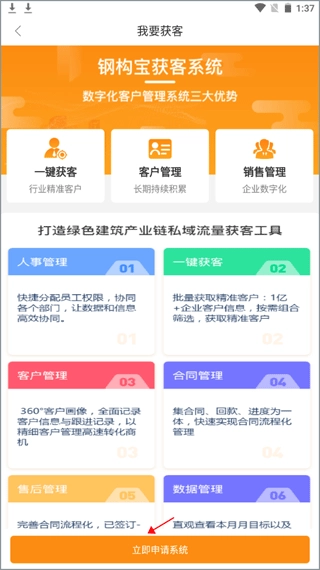 你可以查看获客系统的功能说明,了解如何启用该系统,启用后就能使用客户管理、合同管理等功能,请点击下方的“立即申请系统”按钮。
