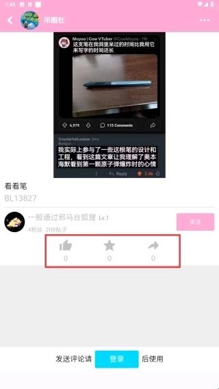 2、在用户帖子页,可点赞、收藏、转发互动。