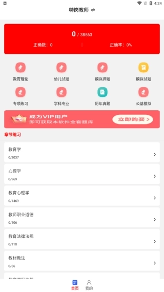 2、海量题库资源:包含历年真题、模拟试题、章节练习等多种类型,题量充足,覆盖教育学、心理学、学科知识、法律法规、职业道德等多个领域。