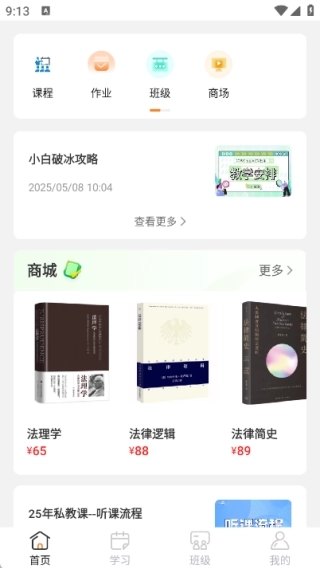 1、首页设有课程、作业、班级、商场等版块,还提供小白破冰攻略,方便用户了解商城内的各类书籍。