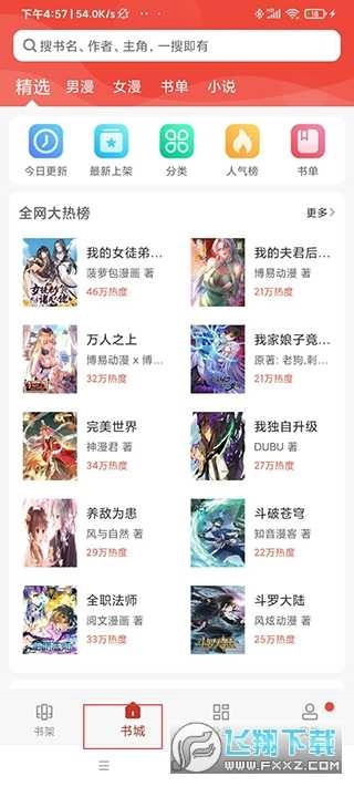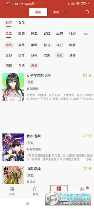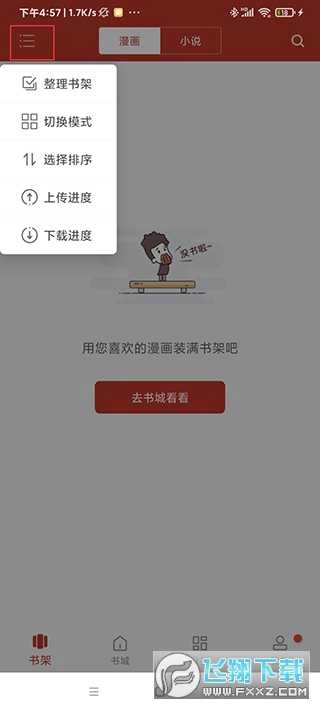 1、安装完成后打开应用,首页为书架页面,用于收藏喜欢的漫画和小说;