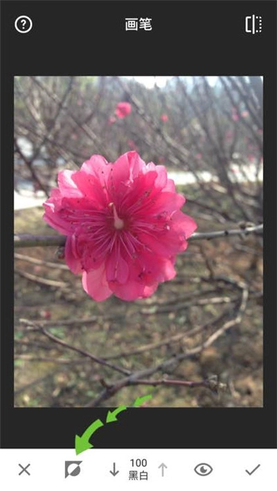 4、点击右下角的画笔图标,此时画面会切换为全黑蒙版状态。放大图像后,用手指涂抹想要呈现彩色的区域,就能达成局部上色或双色调的视觉效果。