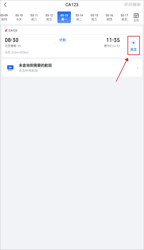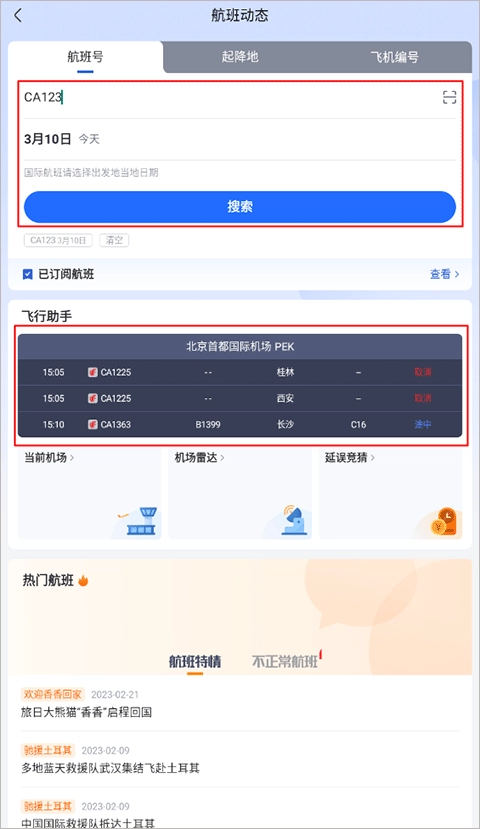 2、你既可以在该页面搜索航班号进行关注,也能在飞行助手模块点击航班来实现关注。