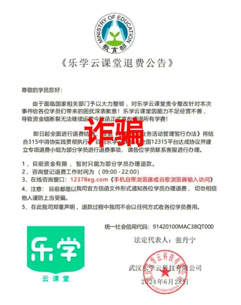 乐学云课堂是为广大学历提升教育机构提供技术支持的平台。近期,发现有不法分子冒充乐学云课堂工作人员,以“经营不善、资金链断裂”等虚假理由为幌子,声称可办理退款,诱导学员通过链接、微信等渠道提供姓名及手机号,实施诈骗活动。请大家提高警惕,切勿轻信此类信息,保护好个人信息安全。