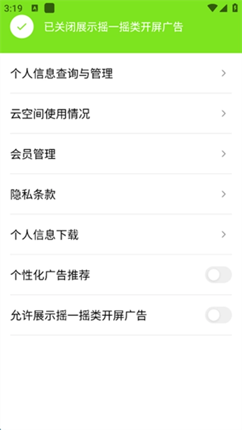 4、找到屏幕下方的“个性化广告推荐”与“允许展示摇一摇类开屏广告”这两个选项,点击它们右侧对应的“开关键”,把这两个开关关闭就可以了。