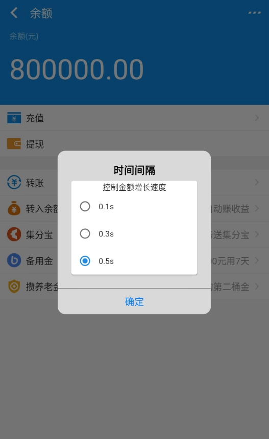 4、若大家希望把控金额增长的速度,可点击【转账】按钮,对时间间隔进行调整。