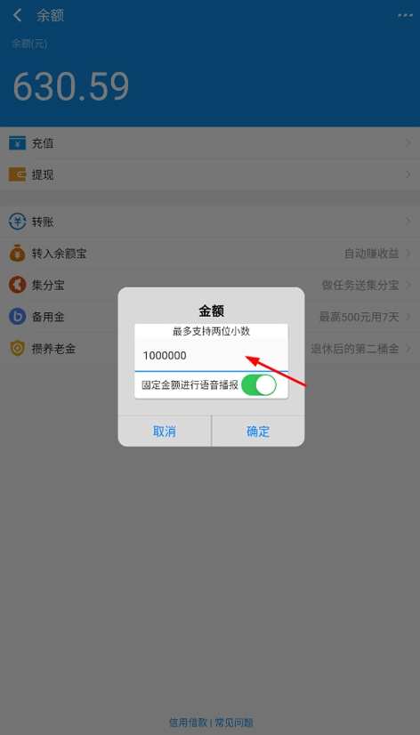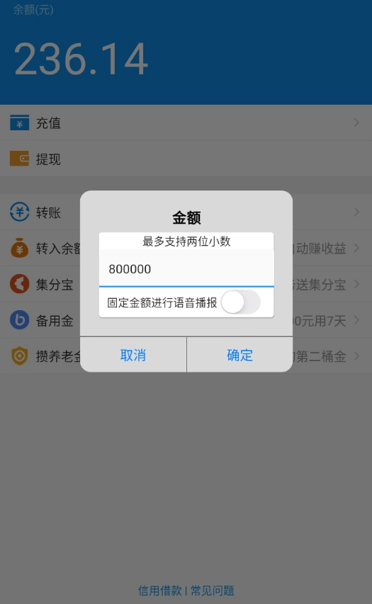 2、然后选择需要修改的余额,同时开启语音播报功能,点击确定按钮;