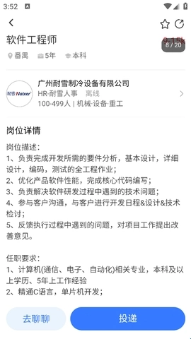 5、可以继续浏览筛选,找到感兴趣的岗位后点击进入详情页,既可以直接投递简历,也可以和HR聊一聊。