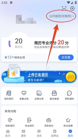 2、接着点击头像旁边的“公开简历(可推荐)”选项。