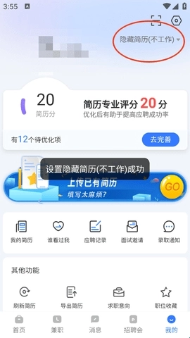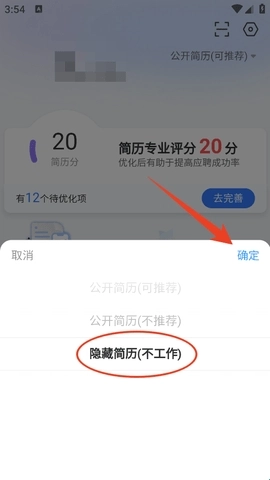 3、接着设置为“隐藏简历”。