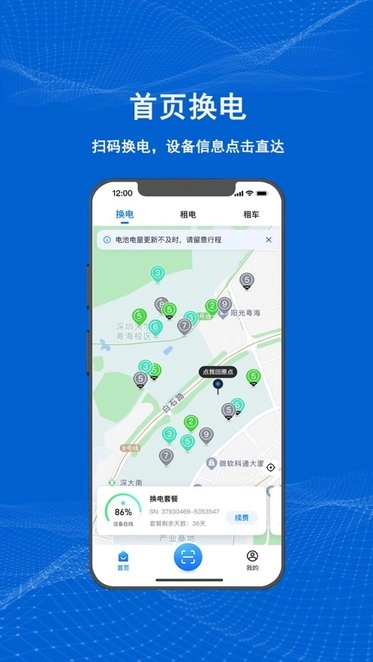注册账号并登录后,即可查看周边换电柜,购买相应套餐后,就能进行扫码换电操作。