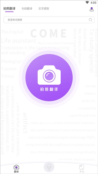 拍照翻译王是一款相当好用的全能手机拍照翻译类型软件,在这款软件之中很好的集成了对话、拍照、文本翻译以及扫描等等各种不同的翻译软件于一体,支持翻译互传、中文翻外文等等各种不同的功能。拍照翻译王之中的操作也相当的简单,比如说在文字翻一下,用户只需要输入翻译的文本就可以,拍照模式下也可以直接将你的摄像头对准需要翻译的语言,拍个照就可以直接享受到翻译的直接。