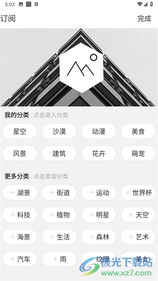 1、打开软件进入之后,这里可以选择感兴趣的类型,然后点击点击右上角的完成选项。